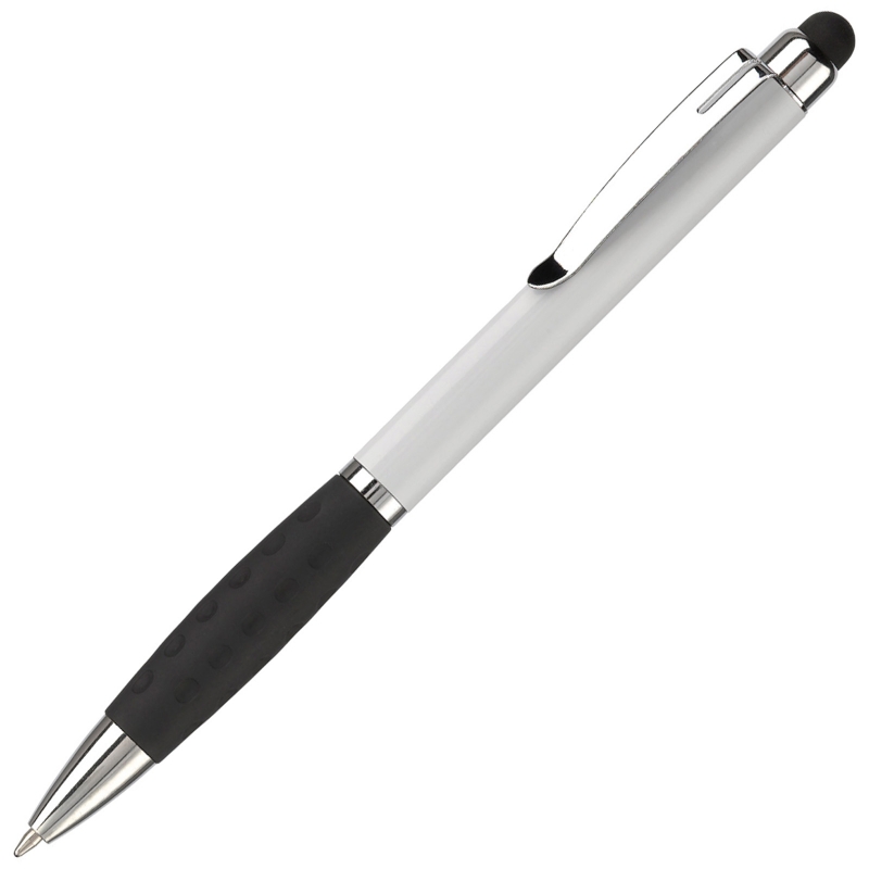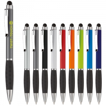 Svinčnik za zaslon na dotik iz umetne mase, zasnovan s kovino in gumijastim oprijemom. Zviti mehanizem. Modro polnjenje.