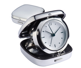 Stabilna potovalna budilka v kovinskem ohišju z natančno tehnologijo, vključuje baterijo.