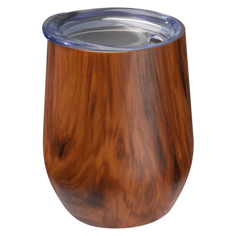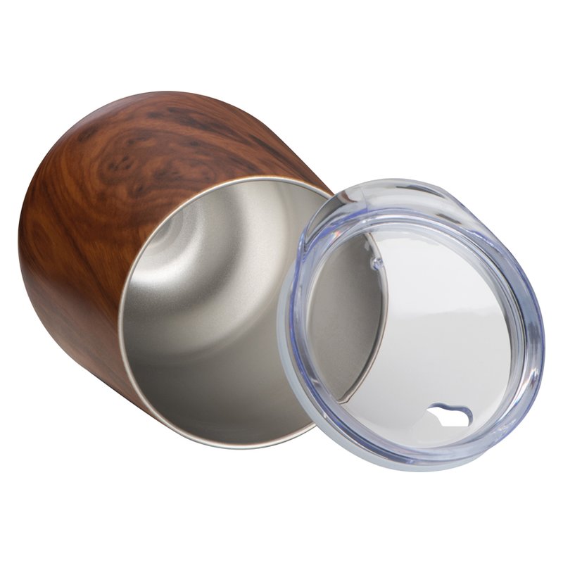 Skodelica iz nerjavečega jekla - imitacija lesa  s prostornino 380 ml in plastičnim pokrovom.